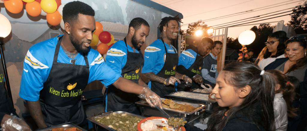 LA Charger Casey Hayward brings an early Thanksgiving meal to families at a Santa Ana school